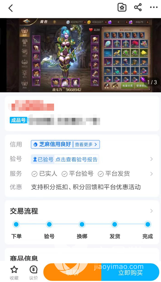 2、平台内的每一个商品详情页内,玩家们都可以了解到账号属于哪一种类型。如果是成品号的话,就代表该游戏账号已经发展得十分完善,拥有高等级的角色,也包含了大量后期才可以使用的高级装备。购买这一类账号,玩家们将体验到更多有趣的新鲜内容。