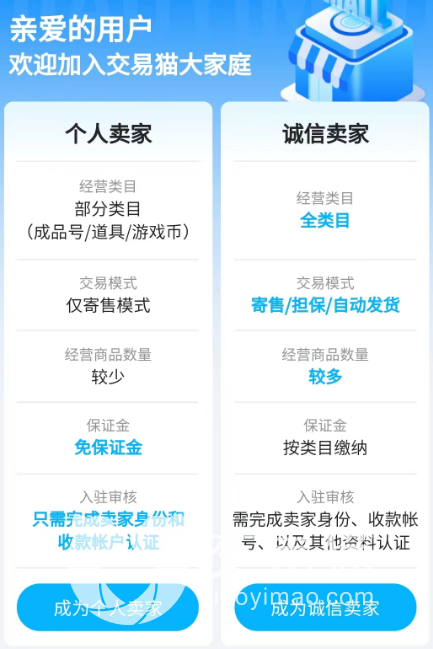 1、在交易猫里成为卖家只需要进行实名认证,在诚信卖家和个人卖家中做出选择,如果选择个人卖家则无需支付保证金,适合游戏玩家纯出售账号,因为涉及到实名认证问题,所以在平台中进行验证会更加有安全性,避免信息泄露的可能性。