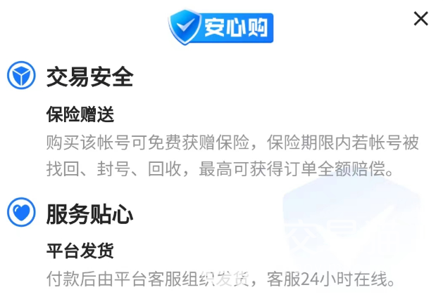 其实让小编看中的还有安全性问题,交易猫里面有些商品是附带平台赠送保险的,凡是商品里带有“安心购”的,找回后就能享受平台退款赔偿,但这种情况基本不会出现,因为卖家都需要实名。
