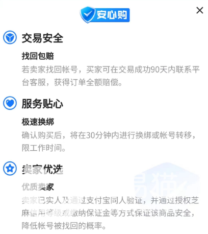 因为大家在买号的时候是不能上号去验号的,所以很担心买来的号和商家所介绍的不同,交易猫里就有平台验号的功能,但凡是被验过的账号都有自己的验号报告,所以大家可以放心去选择购买,而且在验号阶段买家也有权利无理由去终止交易,退款的速度也相当快。