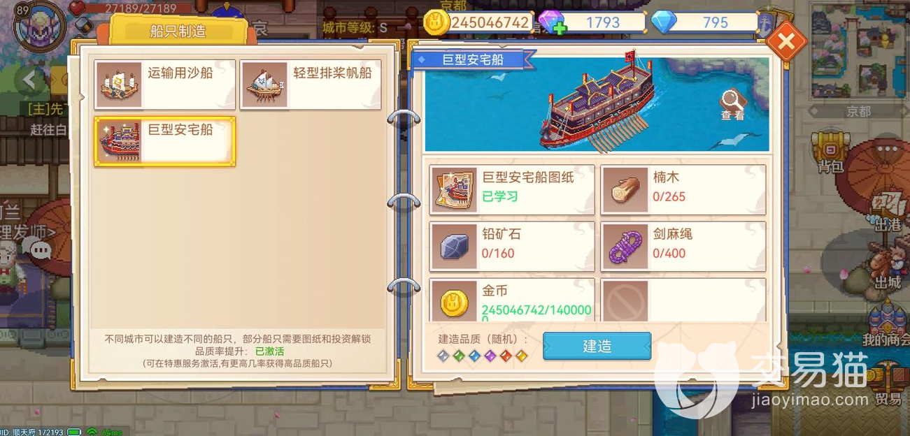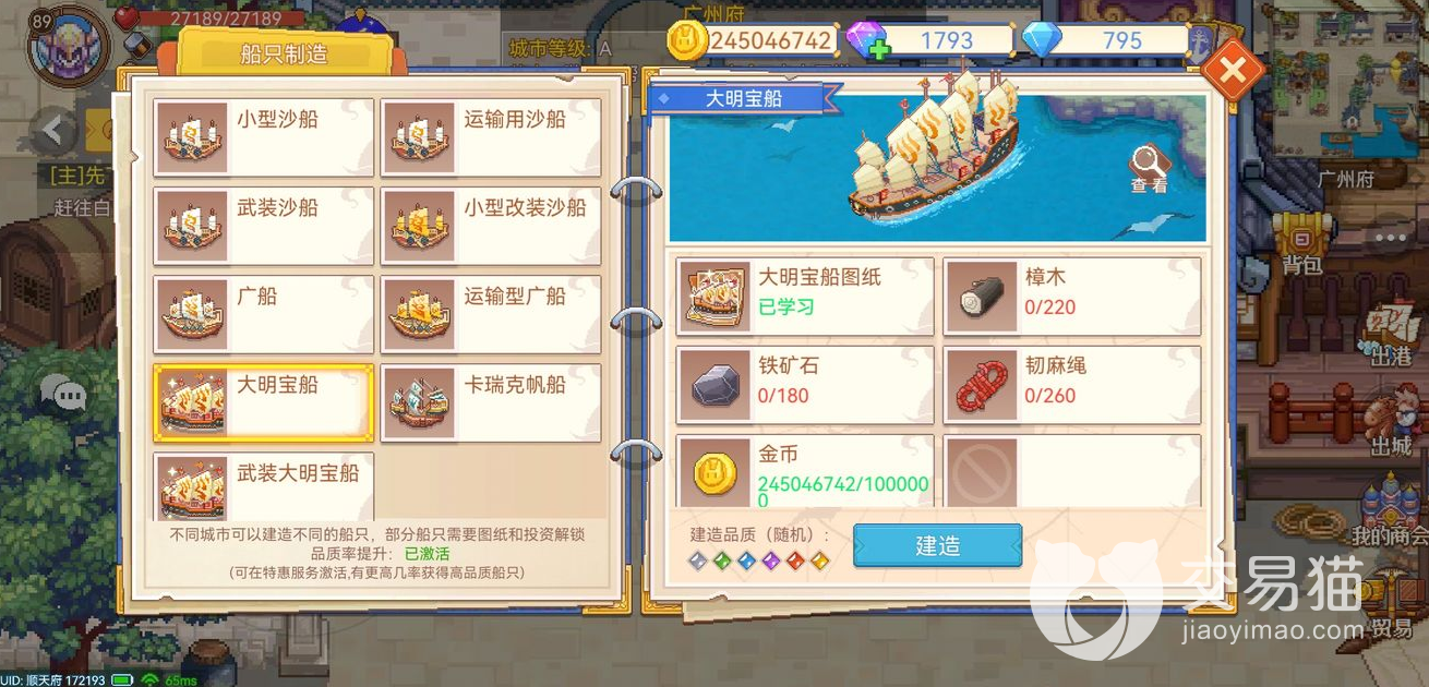 首先我们来说一下商船,目前的版本里商船只有两艘大明宝船和大型商用盖伦。我们分别来说一下两艘船的图纸怎么获得以及建造方法。