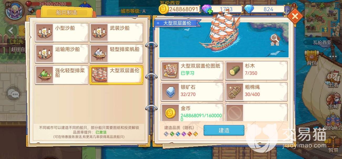 有一艘船叫做大型双层盖伦,需要的材料有杉木350、银矿石270、粗棉绳400以及金币160万到达瓦伦西亚,寻找工匠就能建造这艘大型双层盖伦了。