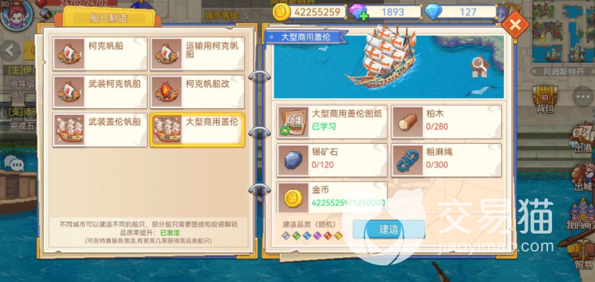 加莱大型排桨船这艘船的建造同样不简单,需要玩家先去到黑胡子临时基地获取图纸接着带着270根樟木、120个铁矿石、350根韧麻绳以及100万金币抵达开罗或是索法拉建造大船。