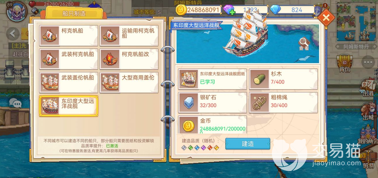 说完了商船我们现在就来说一下战船,最先要说的战船叫做东印度大型远洋战舰这艘战船玩家需要到达拉普捷夫补给站获取图纸后,带上四百个杉木、三百个银矿石、四百个粗棉绳400,以及三百万的金币这些材料抵达阿姆斯特丹,方能建造。