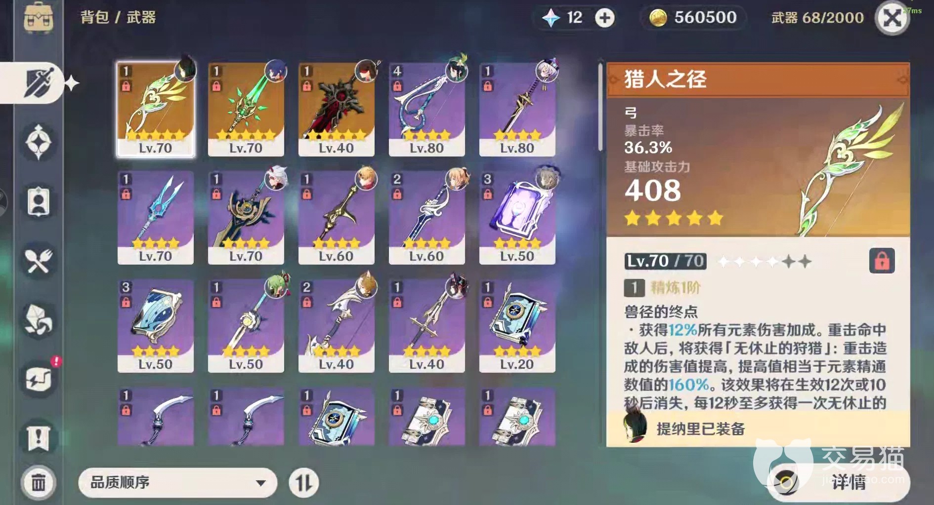 1000元的预算大概能够在交易猫平台上买到57~58级的成品号,冒险等级大概都在57级以上,五星角色的话如果低于15个就说明该账号的性价比不高,五星级武器至少要在八个才能够满足这个价位的质量,像什么符合版本比较厉害的满命八重、三神一帝、三命琴是全部都要包含的,当然这是要看号主主要是往哪方面培养的。
