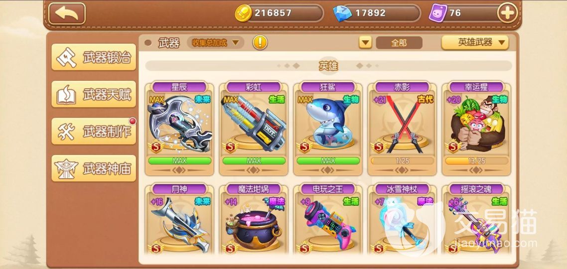 买弹弹堂账号的玩家们肯定是看自己的装备不太好,像烈火、手术刀和炸弹这种基础的武器虽然各自有各自的特色,但是总没有后来推出的武器强势,不仅有着更大的爆炸范围、挖坑能力以及抗风稳定性,连伤害都会额外增加,最关键的是欧皇玩家的成品账号都是已经帮助大家强化好的,入手之后就可以玩,在交易猫的选择还特别多。