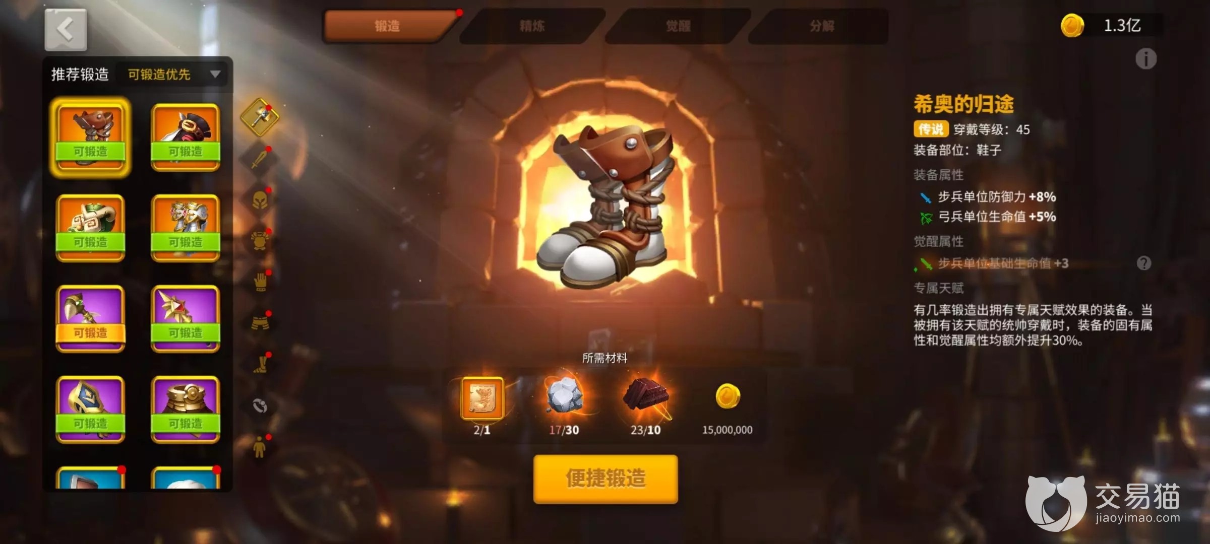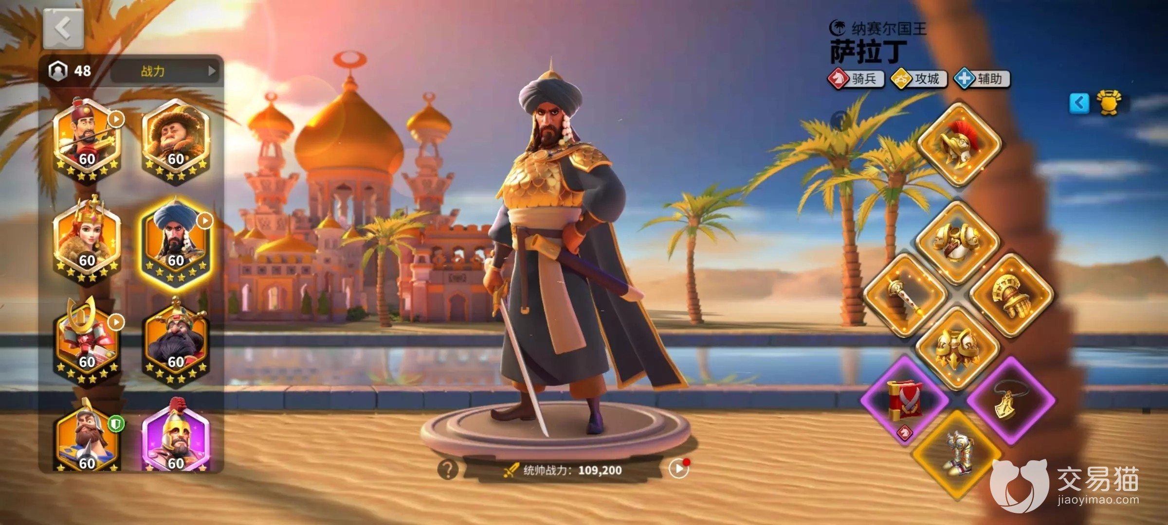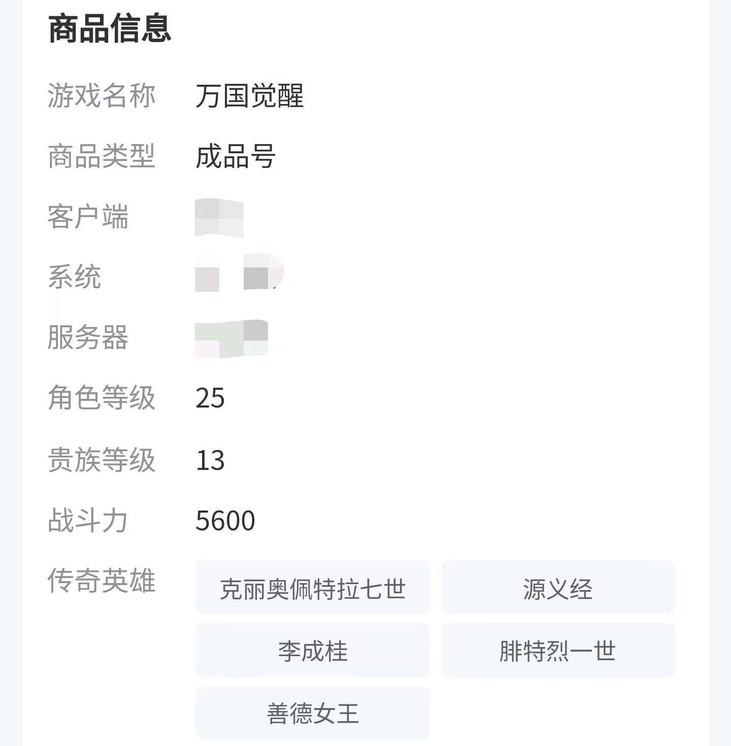 万国觉醒的成品号其实是分为很多种的:骑兵号、采集号、驻防号、填兵号、包移民账号,这是取决于玩家们喜欢在游戏内走的某种战略类型而决定的,但大部分玩家目前都喜欢版本比较强势的骑兵,具体有哪些武将大家可以详细的点击商品链接查看,就可以清晰的看到贵族等级、角色等级、战斗力、传奇英雄的数量,除此之外如果对传奇英雄有要求的话那么也可以单独的输入,比如理查一世、亚历山大大帝根据名字直接来搜索账号。
