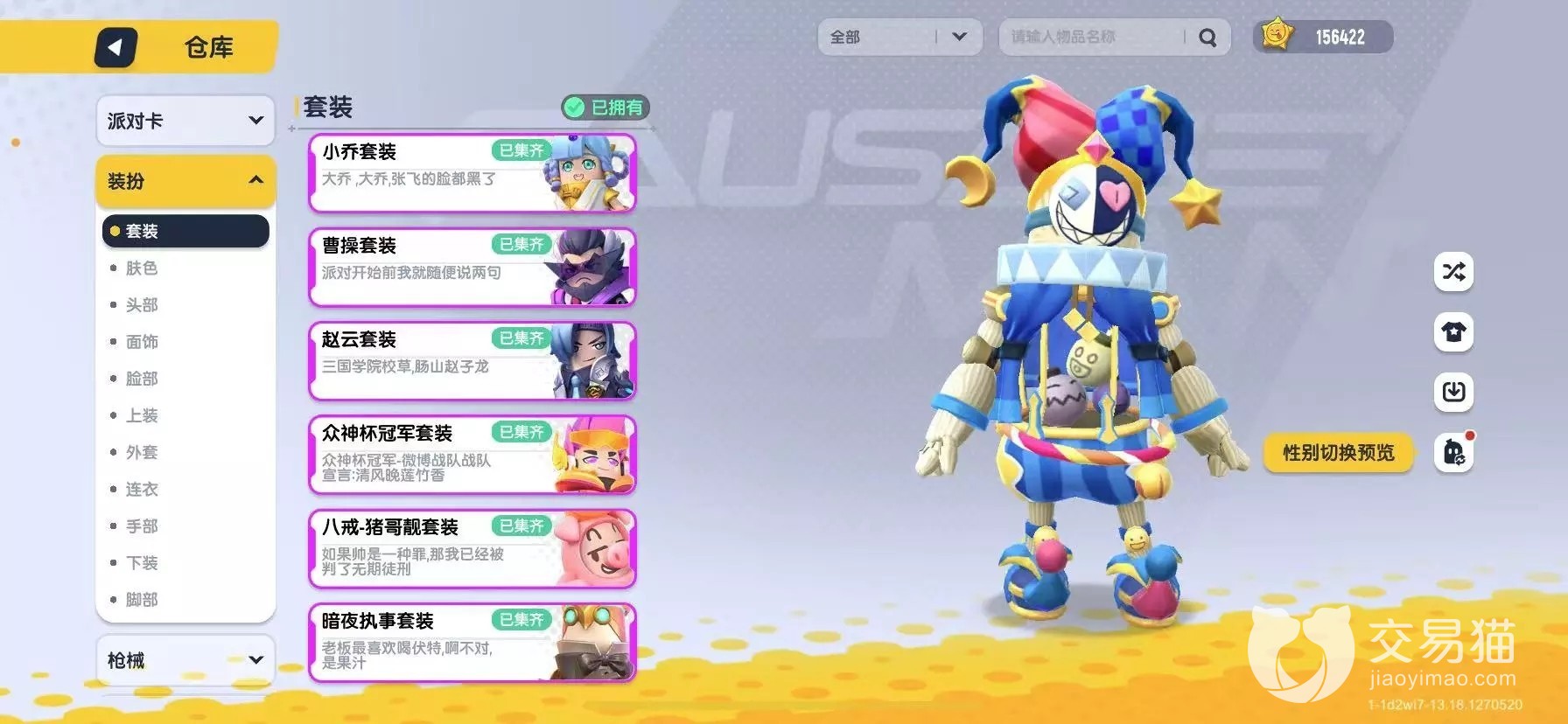 如果说香肠派对中自S1赛季到S5赛季要评价一个最酷炫的套装,那绝对是小丑团长,这也是为什么很多玩家打算在买号的时候想要选择小丑号的原因。香肠派对小丑号卖号去哪里最近大家的比较多,正是因为小丑团长皮肤的稀缺性,才会让大家在卖号的时候敢叫高一点价格,万一哪天突然返厂可就不值这个价了,所以小编今天给大家推荐的交易猫就比较适合卖号。
