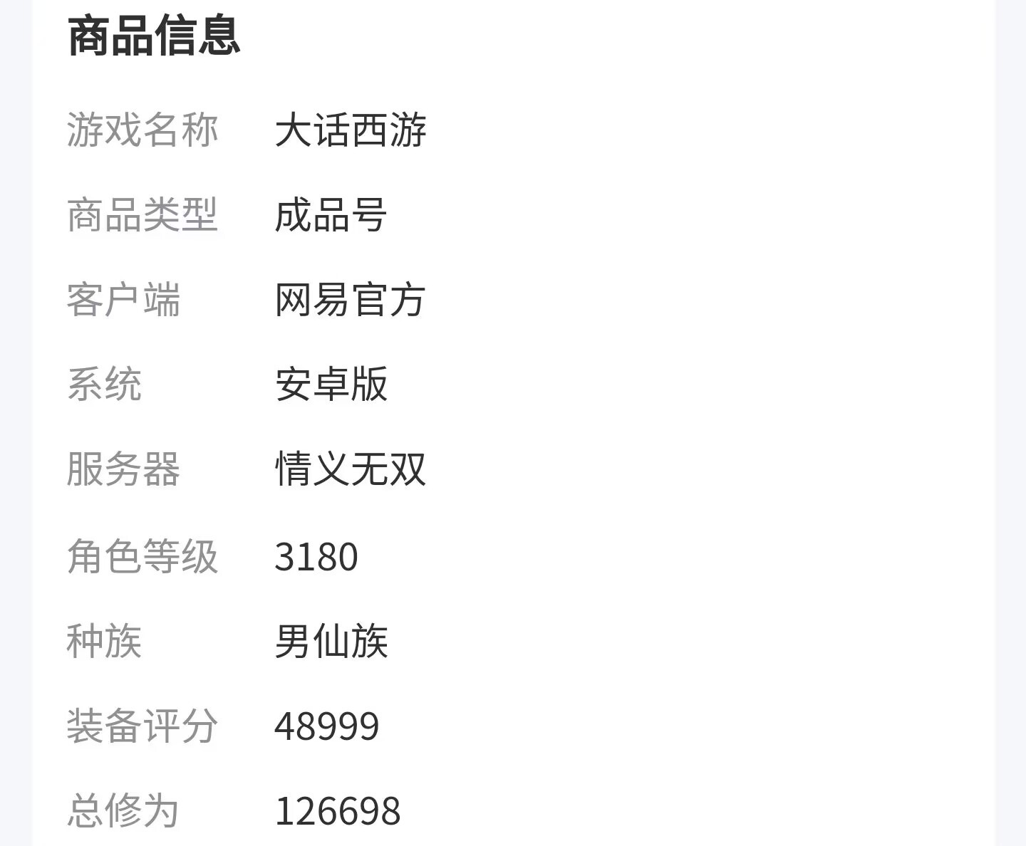 玩家们在挑选大话西游账号的时候,可以看到交易猫贴心的商品信息分类,而不是一大段冗杂的账号介绍,直接就能了解到这个商品是哪一个客户端、角色等级、种族、装备评分、总修为这种关键信息,感觉符合自己的要求在向上划到截图细细查看,可以省掉不少筛选的时间。