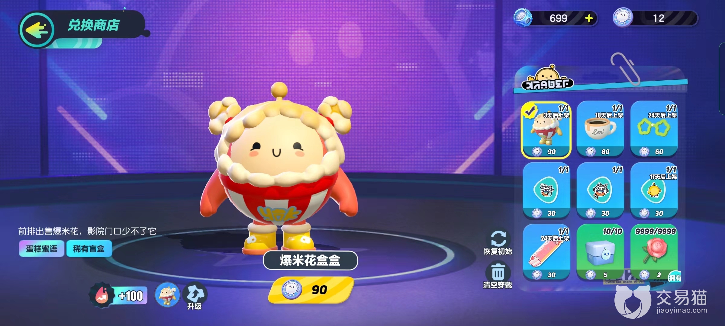 商城内目前陈列着一款稀有皮肤名叫爆米花盒盒,一个名叫浓缩黑咖啡的配饰一款花朵眼睛以及一个行礼动作、两个表情加一个姓名框。这些都是玩家可以使用蛋糕币进行兑换的,每个商品需要的蛋糕币都不相同,因此玩家想要皮肤的话一定是需要好好积攒的,稀有皮肤需要90个蛋糕币呢!