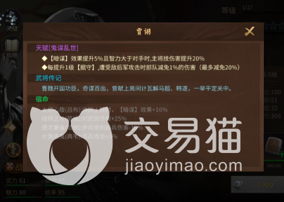 贾诩的天赋叫做鬼谋乱世,作为一个暗谋的角色,他的长处都点在了智力上,利用这个天赋可以进行一次判定,这个判定中大家可以看贾诩的智力是多少,如果他的智力是高于敌方的,那么他队伍中的将领战斗力可以直接往上提升。