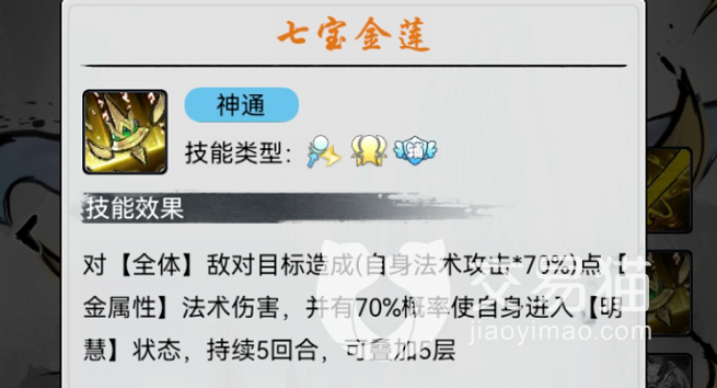 他的一技能为慧剑诀,属于一个攻击技能,可以对敌方对目标造成自身法术攻击伤害50%的金属性伤害,并且有35%的概率使自身进入明慧状态,可以提升15%的暴击效果,持续时间为五回合,最多可以叠加五层,也就是75%的暴击伤害。他的二技能为七宝金莲,同样是一个神通技能,可以对敌方全体目标造成范围性伤害,最高可以叠加70%的法术攻击伤害,并且有70%的概率使自身进入明慧状态提升,最大限度提升暴击率。