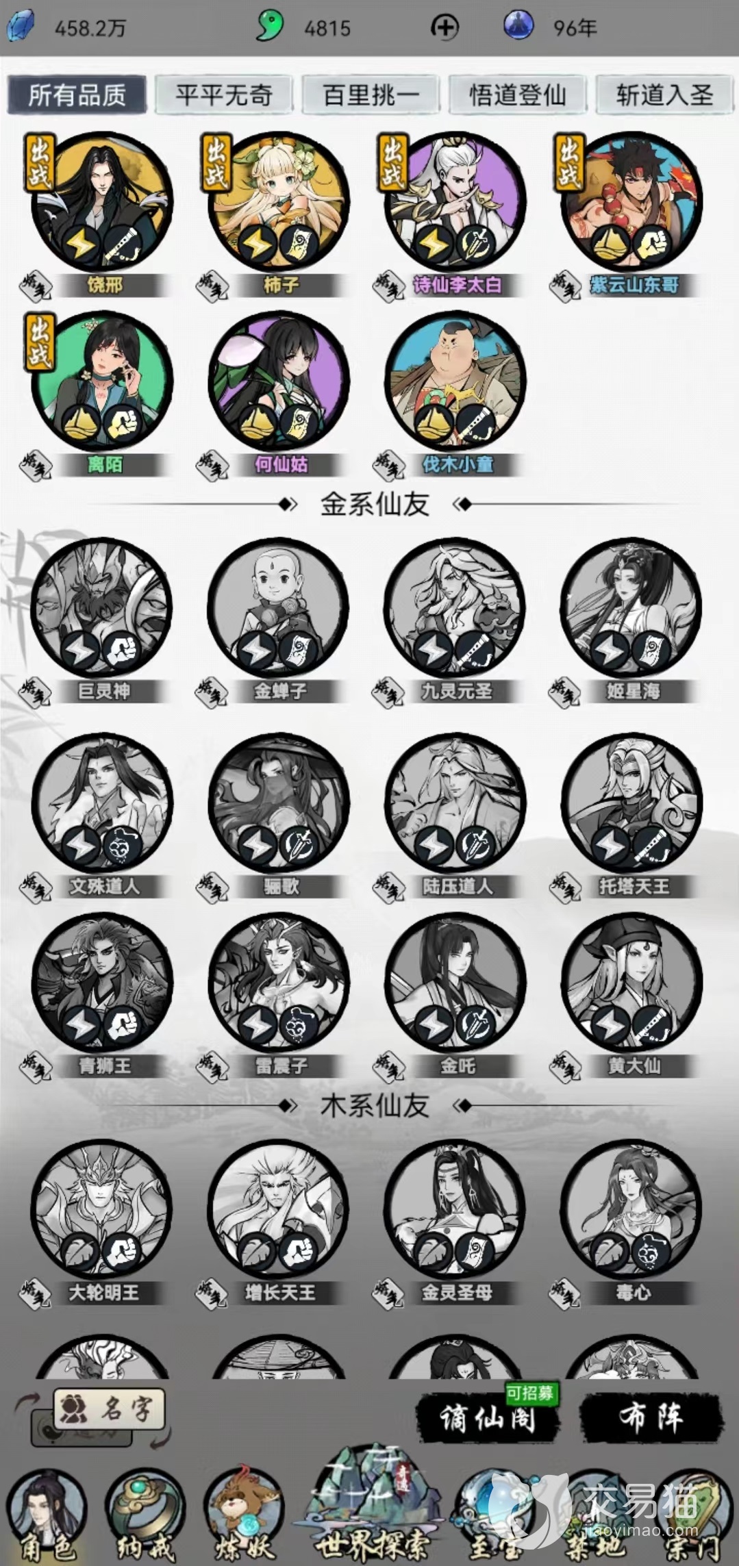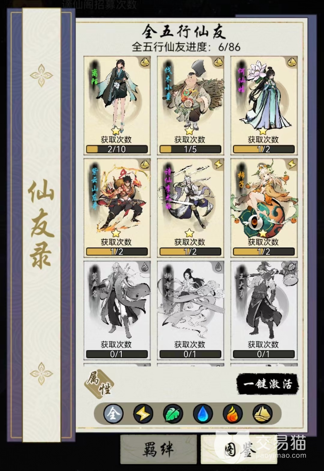如果主角是金属性,那么就不要再上金属性伙伴,而是在木、水、火、土中各选一个。无论是角色里还是图鉴中,仙友都是按照属性进行划分所以不会找错,目前所有角色按照资质分为平平无奇,百里挑一,悟道登仙,斩道入圣,一般来说优先选择品质最高的出战。。