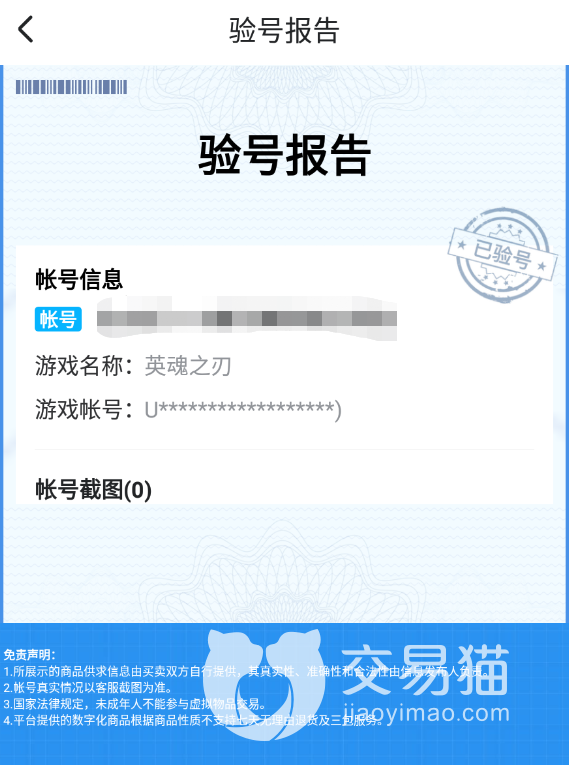 2、官方验号认证,公式真实的验号报告。 出售账号之前可以使用交易猫平台自带的验号功能,为用户提供售前人工认证,专业客服完成验号之后,会在账号交易界面上公示一份有影响力的验号报告,让买家确认账号的真实情况,提升交易成功率。