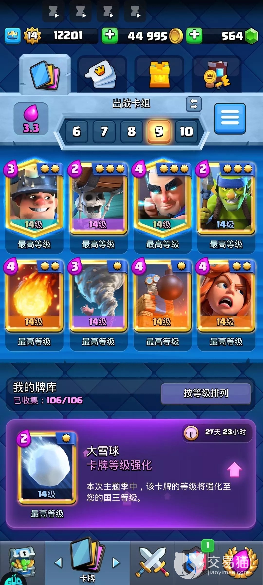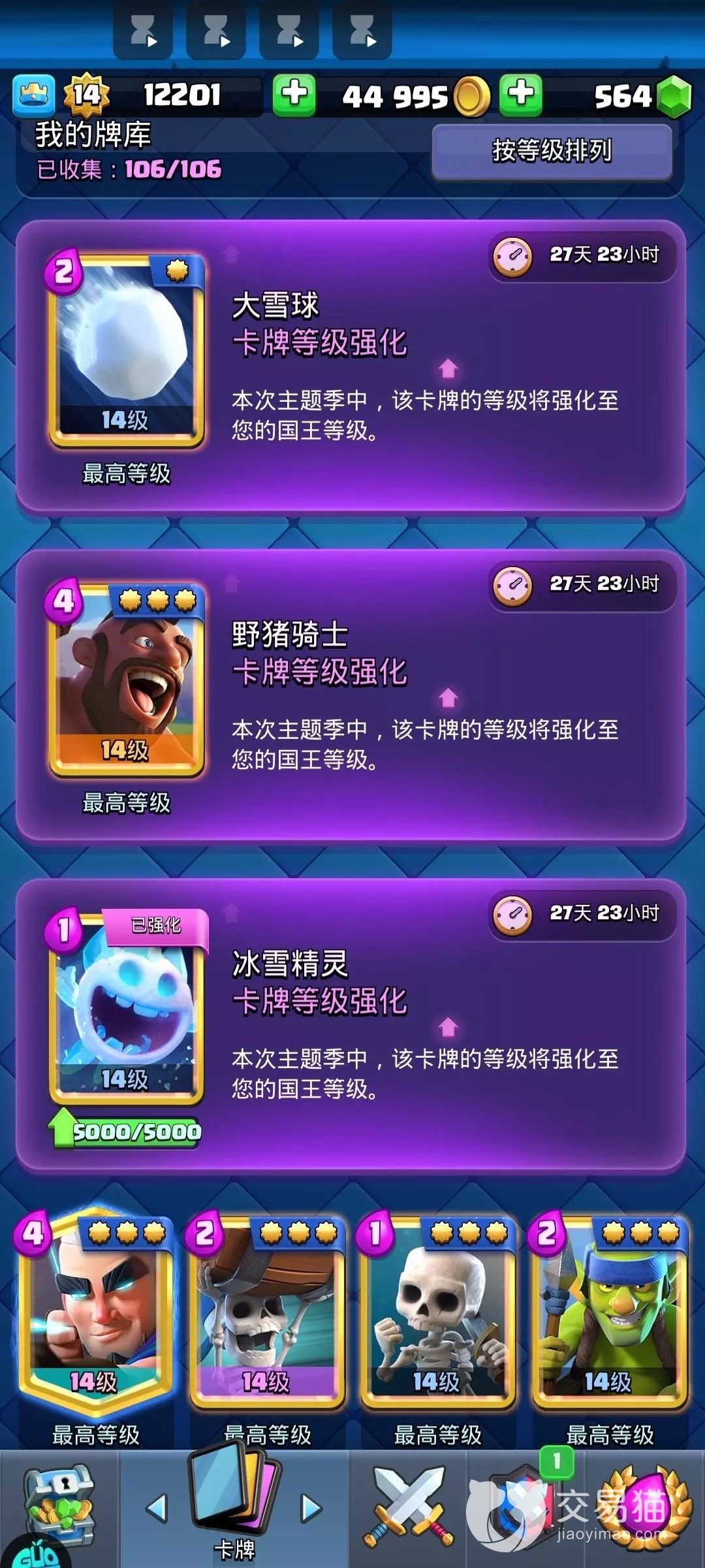 今天给大家带来的皇室战争卖号为什么这么便宜目前就到这里了,同样的账号资源和物品没有必要非得参考他人的价格,只要出售的价格对得起自己的时间和精力即使卖的慢一点也没关系,能找到爱惜账号的买家有的时候卖便宜一点也是甘愿的,选交易猫准没错。