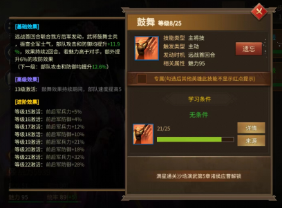 后期提升这个角色以后,她的技能数值也会增加,比如其中对于男性武将的免伤就直接提升到百分之二十,这个天赋配上鼓舞技能就可以振奋士气,提升防御,这个角色大家拥有的话比较适合放在阵容中哦。