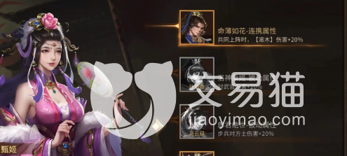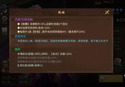 她的的天赋叫做落花无痕,在搭配了鼓舞这个技能的时候可以在其中保持两个回合的加成攻击效果,不仅是为自己加成,也可以为队伍中的角色加成,你可以通过其中的魅力值来压榨其中的男性角色,因为魅力值高,所以有男性武将在场上的话可以造成百分之十五的免伤效果。