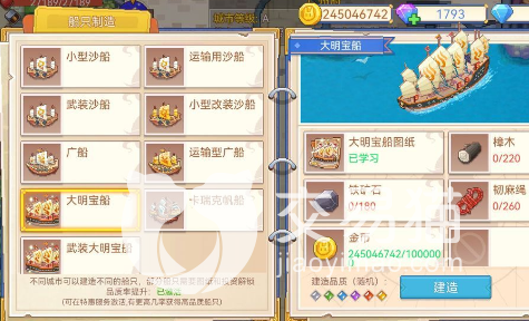 这条船也是一条军船,基础的属性上要比上面的船稍差一点,所以建造的时候也会少一点需要的材料,但是在外在形象上是偏向于西式的,跟中式的船只有明显的不一样,这一点在外在形象上是很容易分别的。