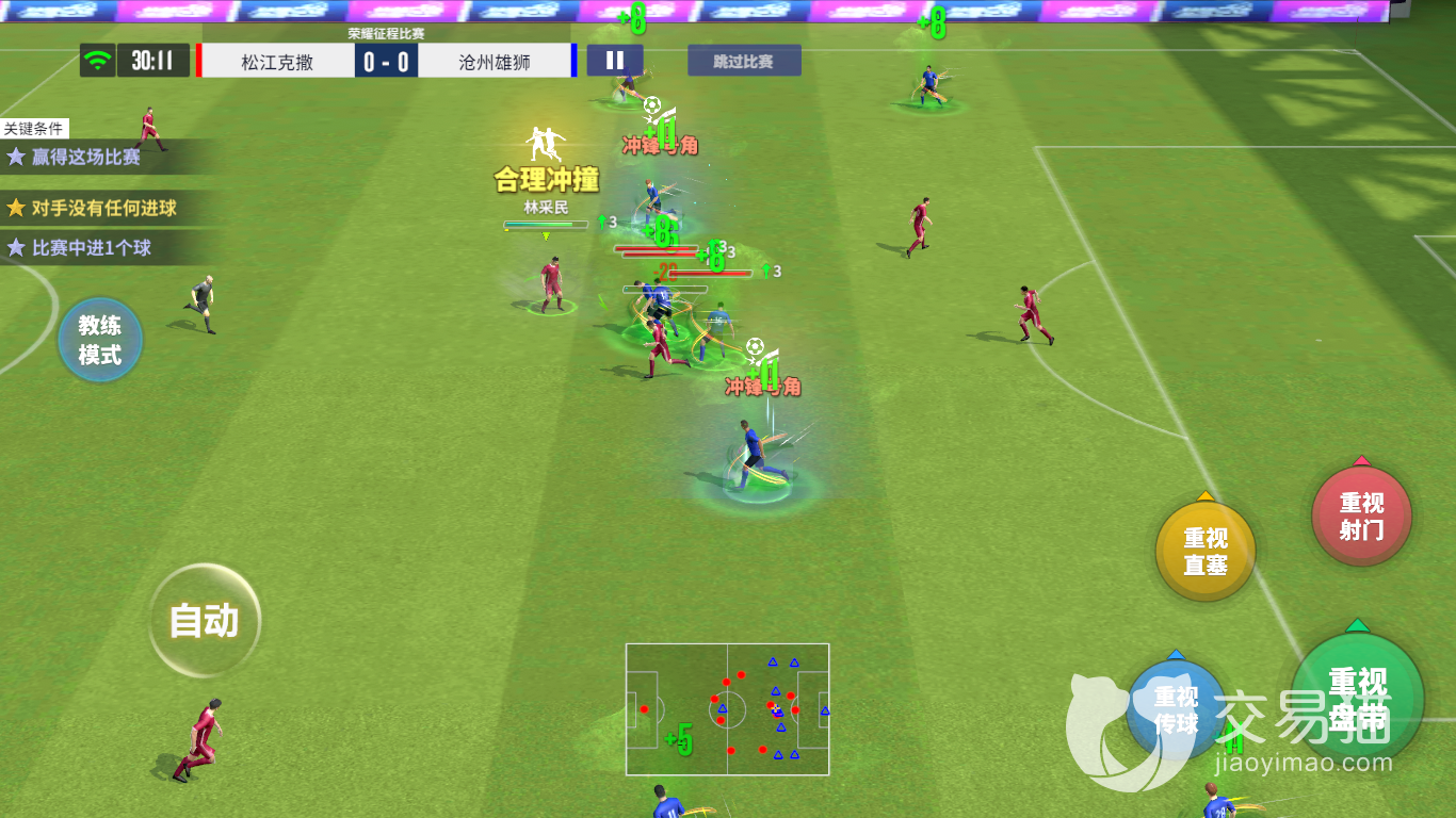 游戏中如果被对手抢走球就会进入防守回合,和进攻回合一样,它同样有着四个按键,如果觉得麻烦是可以点击教练模式进行一键防守。