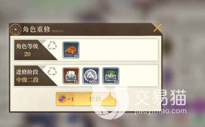 玩家在进入“角色”以后,点击想重置的角色,点击上面的第一个标志就可以进入“角色重修”了,在这里我们可以看到重修后可以获得 的资源,再点击“重修”这个角色就可以被重置了。