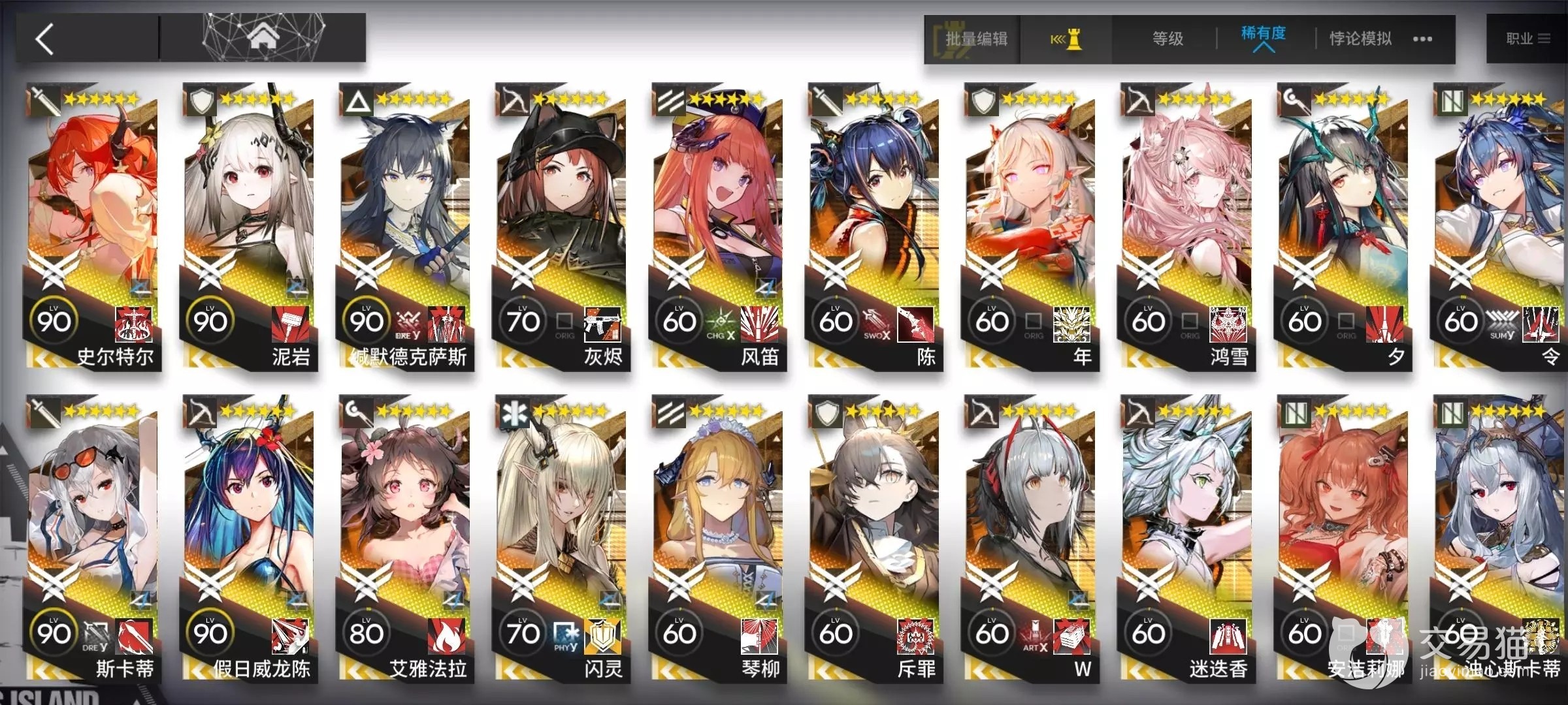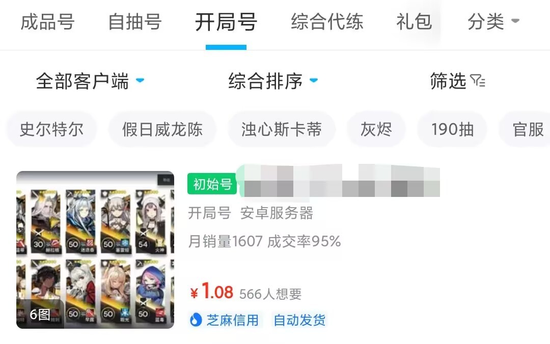 明日方舟的自抽号和开局号其实更推荐大家选择的是前者,因为游戏内抽卡必定不重复的机制针对很多新手账号特别欧气的定律,开局就有五个左右的六星角色不是梦。交易猫售卖的大量自抽号必带保底6~15个六星干原和大量的五星干原,具体还要看大家对于六星干员的数量要求,基本上15个六星的开局号也就10块钱不到,如果对纯玉、合成玉以及其他资源有要求的话,可能账号的价值会额外有所提高。