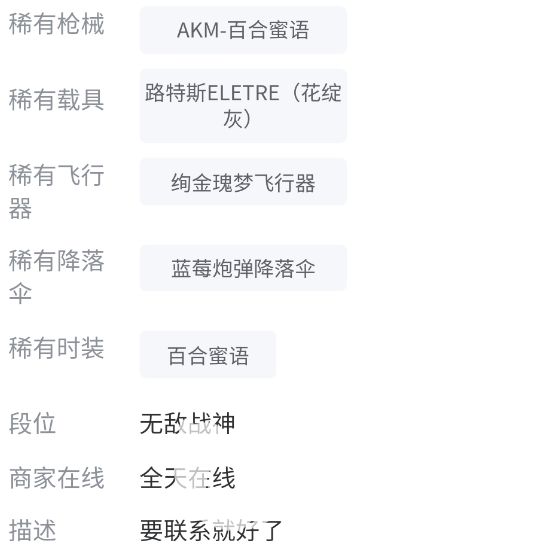 2、玩家买号之前肯定得先知道账号里有什么,比如各个赛季的军需是否齐全,或者包括当前乃至以前赛季的段位和KDA,这些数据通常都会展现在主页的介绍里,稍微细心一点的商家都会很在意这里,一是为了方便买家去看,二也是为了提高成交率。