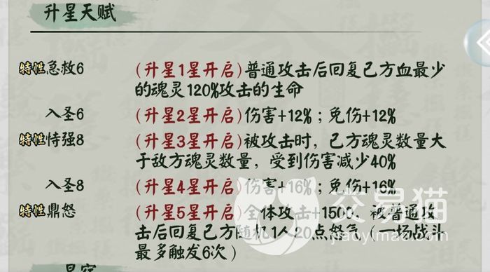 大家在一星的时候,就是的天赋打开了他自己的奶妈旅途,从这个时候开始就可以给自家队友带来很大程度的回血,等大家要是升到5星的时候,还可以另外把回怒的能力得到进一步的加强。