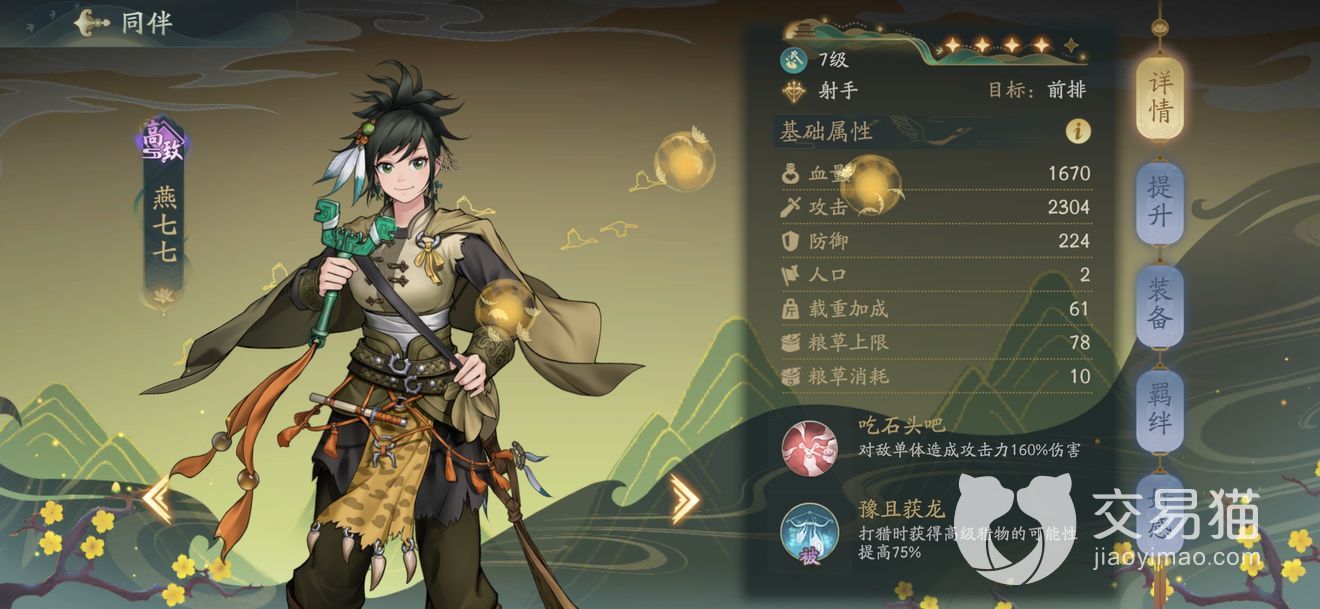 除了他们之外,各位还会在游戏中遇到各种其他角色,他们还能够成为自己的同伴。这些人都会有各自的本领,例如其中就有一位名叫燕七七的女子,她在这里的定位就是个射手,她其中有一项技能是可以打出百分之一百六攻击力的伤害,另一个技能可以用来打猎。