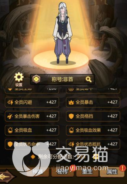 我们主人公有着相当的基础属性,可以给我们队伍里的伙伴提供相当的加成。比如说增加全体闪避或者增加全体暴击伤害或者暴击率等等,这些属性,从攻击到防御到吸血到抵抗以及特殊效果都有涉及。