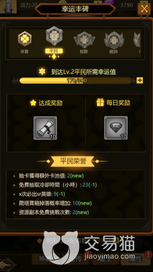 不同的称号可以获得相应的一些加成,比如说可以缩短我们免费抽取的冷却时间,又或者多少次必出sr英雄。又或者我们资源本,每天的免费挑战次数。这些特殊的加成都与我们玩家不同的称号有关,可以说,如果达到了欧皇称号的话,我们所获取的资源以及道具也会越来越多。