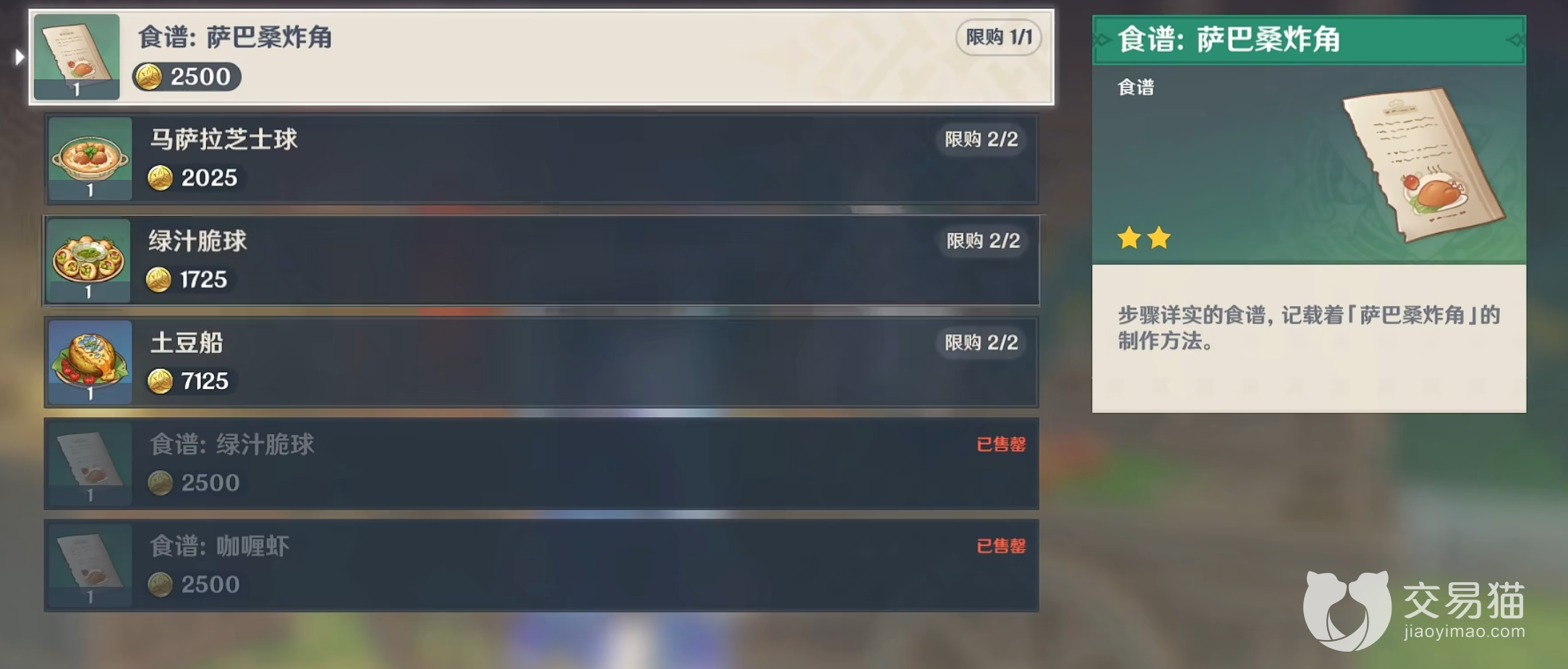 首先玩家来到奥莫斯港,这里会有一个叫做贾汉吉尔的的小吃摊摊主售卖食物还有食谱,这次花2500摩拉就可以兑换萨巴桑炸角,位置很明显,只要来到这个地方随便绕一圈就能找到,路痴玩家多花一点时间吧。