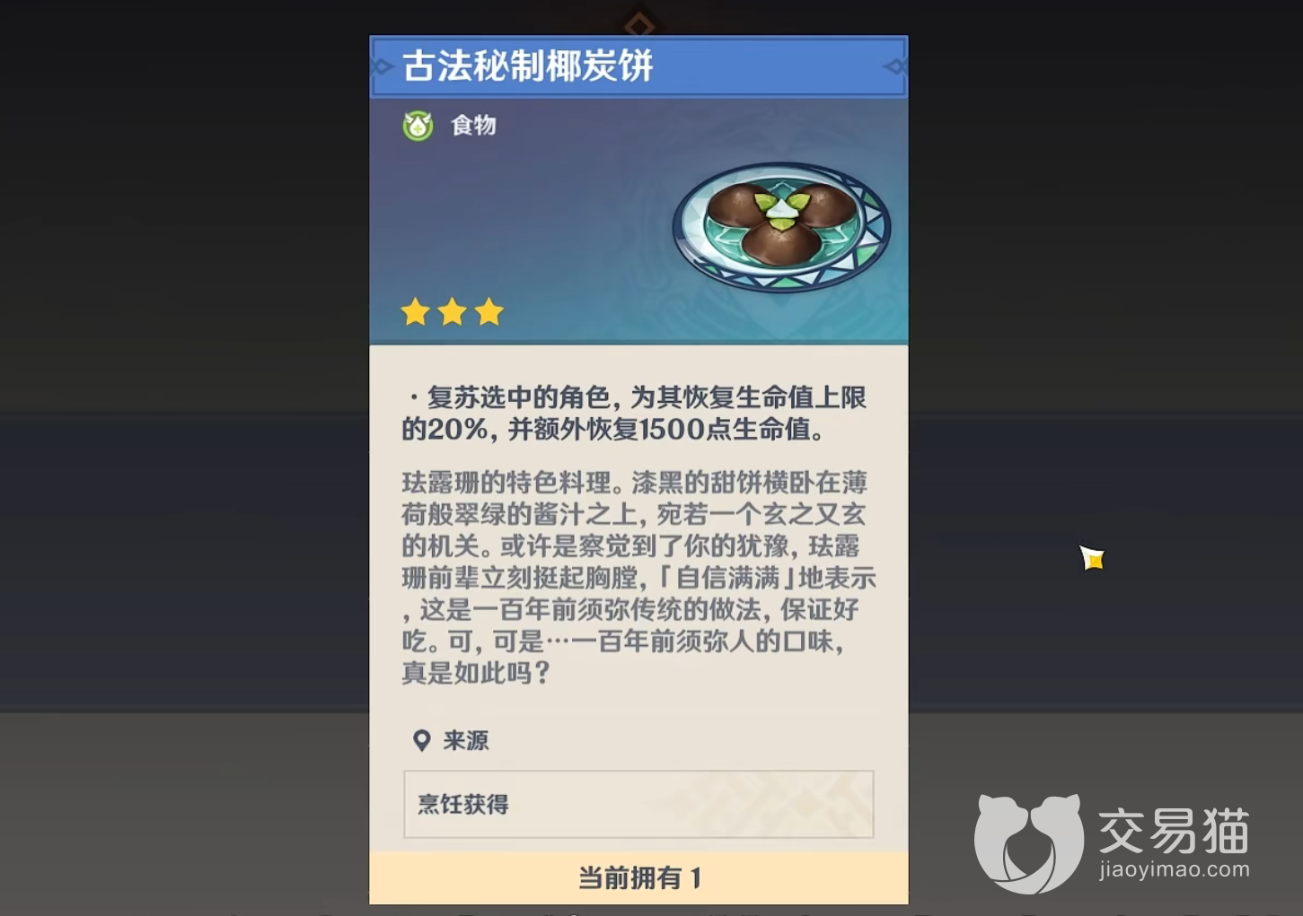 最后就是四星珐露珊的料理了,是椰炭饼这个须弥的特色料理,在她的手上可以变身为古法秘制的椰炭饼用来回血,效果和甜甜花酿鸡差不多,新手可以多带几个少祸害提米的鸽子。