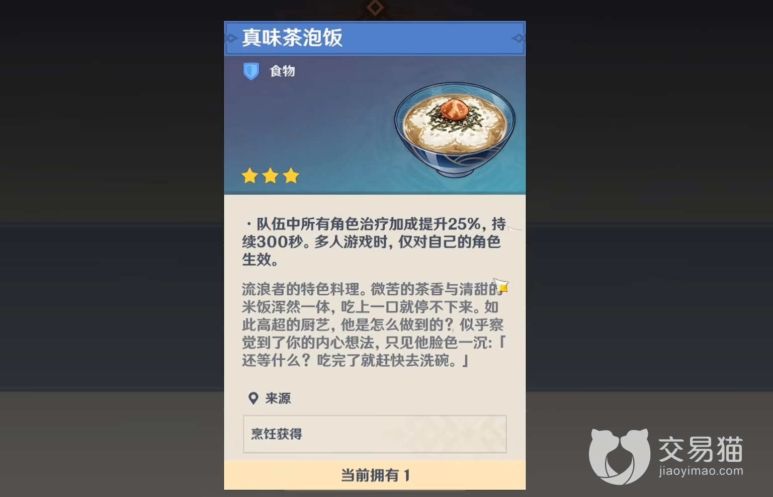 散兵的料理就是茶泡饭,是稻妻的特色料理,将烹饪角色换成这个角色然后就有概率获取真味茶泡饭,图标和效果将会发生巨大的变化,该效果可以增加自己的治疗效果,在周本等大型本中可以使用,大世界也可以偶尔用来保命。