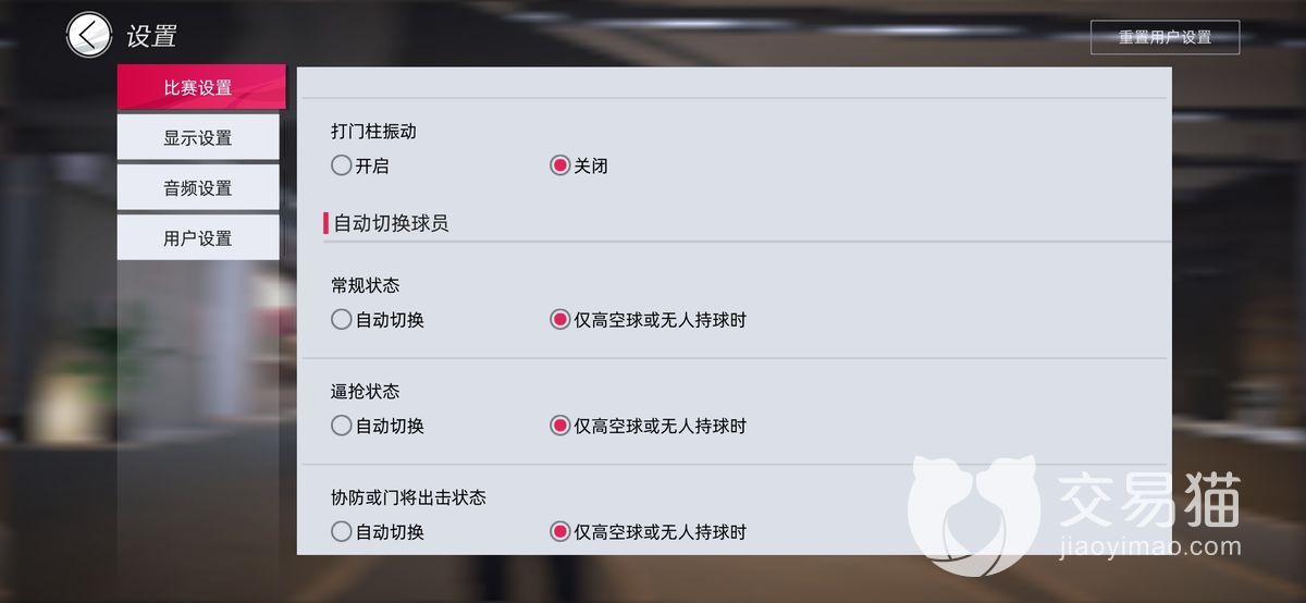 比赛设置:如果你是新手的话,小编觉得全改自动比较好吗,因为比较智能不需要手动进行队员切换,并且的话自动模式可以应对大部分情况,如果你是高手玩家,可以根据自己的习惯来自行调节。打门柱震动的话,关闭还是比较省电的。