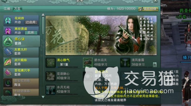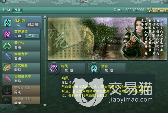 万花主要可以运用分花间游、离经易道这两种内力,一种是输出,一种是治疗。而花间游的两个被动技能,一个是鸣凤,一个是活血。