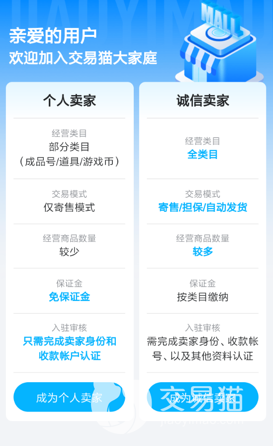 3、而部分自身就拥有高级游戏号的玩家来说,一旦打算脱坑的时候,也可以合理的使用交易猫来完成账号的处理工作。大家只需要进入平台申请一个卖家的资格,就可以开通商品发布的权限,随后大家就可以等待买家来进行下单即可。