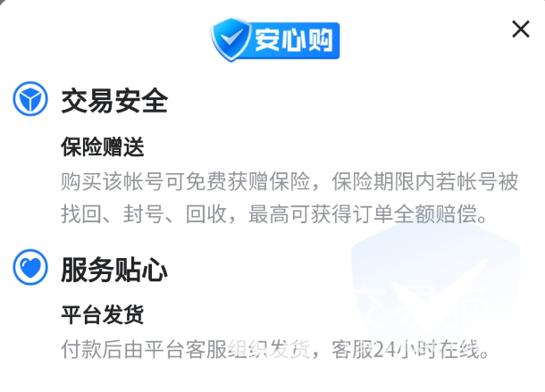 交易猫为了保证买家的消费者权益,也是特意推出了“安心购”免费保险,但这个保险都是卖家选择是否要添加的,所以小编推荐大家还是要优先选择这类账号,因为但凡是敢于附加安心购的卖家都更加可靠一些,这也是对彼此的一种保障承诺。