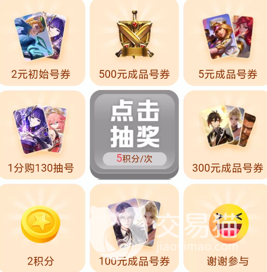 3、要是觉得账号价格还是有些贵的话,大家可以提前一段时间先去注册好交易猫的号,每天完成签到获得积分进行抽奖,里面最高可获得五百元的账号券,再加上地平线5本来的优惠就很大,运气好点的话买到手根本花不了多少钱。