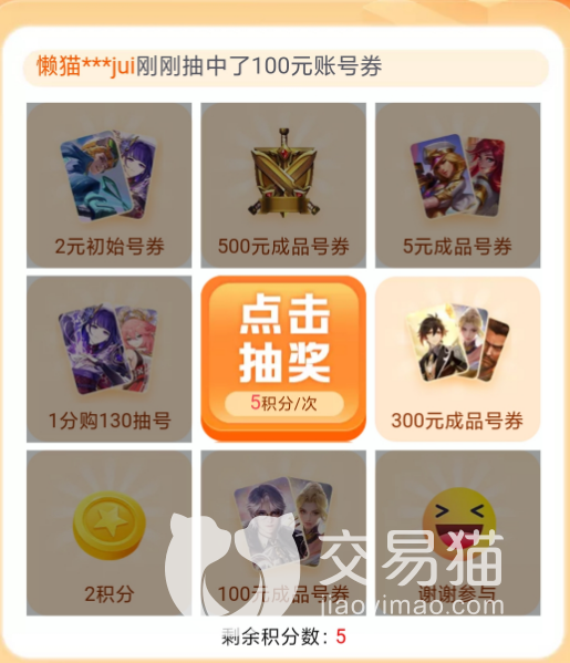 2、完成签到后获得金币可以进行抽奖,奖池当中除了有大额的抵现金额之外还有成品账号,如果人品爆发的话就能省下一大笔钱,虽然这都是有概率性的,可没事攒攒金币也能在买号的时候便宜不少,也算是平台为买家所赠送的一个小小福利。