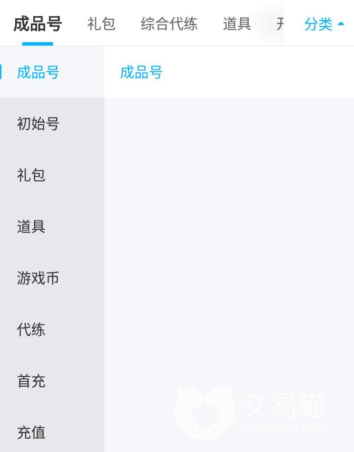 在此平台上,几乎包括了所有游戏,购买时会有一个“分类”选项,里面有多种类型可供选择,比如有“成品号”、“初始号”、“礼包”、“道具”、“游戏币”等,可以说是针对不同用户的不同需求,对症下药,在大家逛平台的同时,省下了不少看没用东西的时间,毕竟买号这种事情,如果让用户逛太长时间,也很容易出现枯燥的情况,而交易猫这种做法就大大减少了概率。