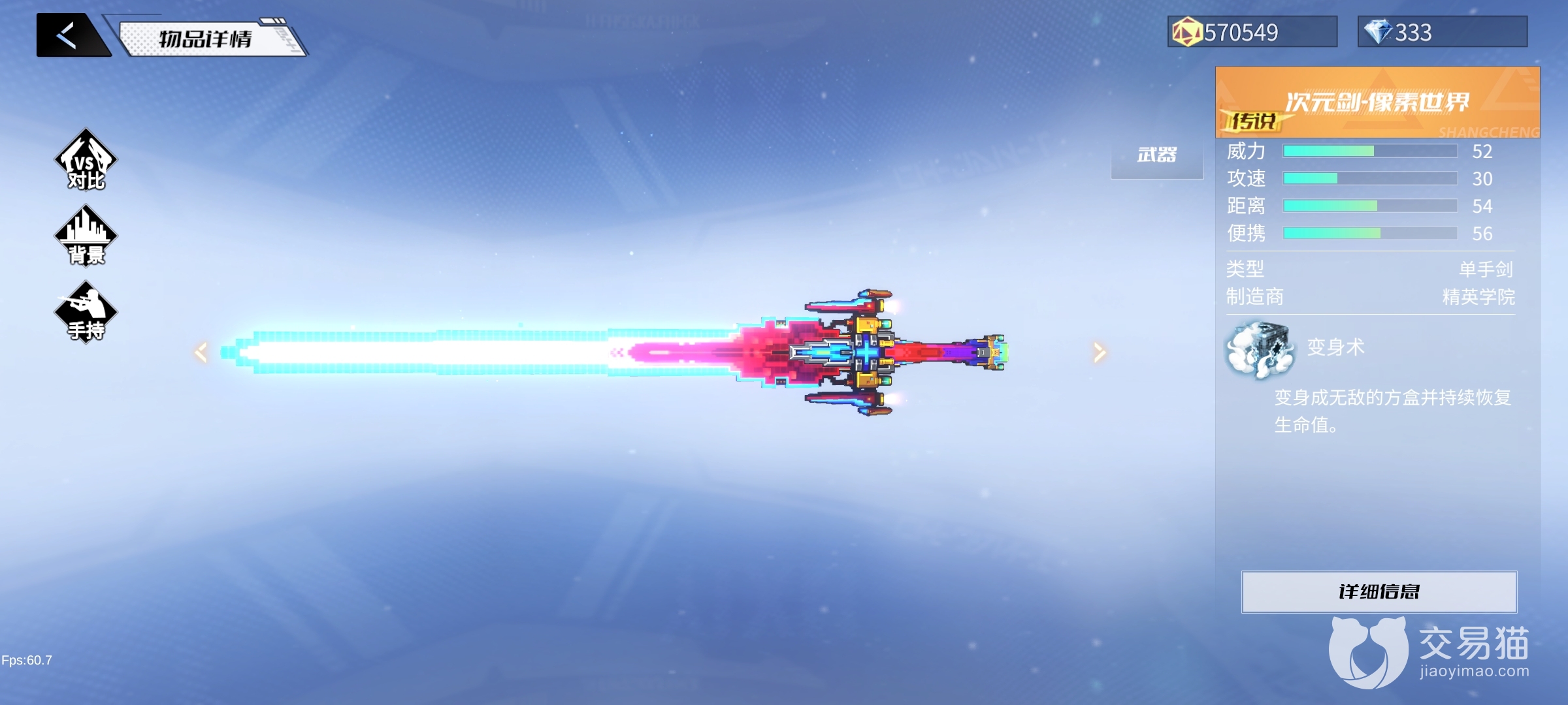 次元剑-像素世界是一把传说武器,它的技能“变身术”可以变身成无敌的方盒并持续恢复生命值。可以进入无敌状态在很多危急的情况下,能帮助我们能躲过一些致命的伤害,而且变成方盒后还能持续回血,利用好这一特点,我们还可以抓住时机对敌人进行反打。