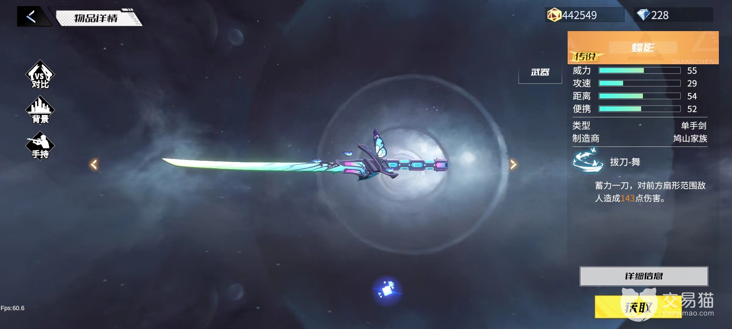 蝶影也是一把传说武器,这把武器在剑柄上站立着一只蝴蝶,会随着我们的挥舞扇动翅膀。它的技能“拔刀-舞”蓄力一刀,对前方扇形的敌人造成143点伤害,造成伤害扇形范围是很广的,差不多是能够环绕自身的360度,这个技能可攻可守,既可以大范围得进攻敌人,也可以用来抵御突然冲刺上来的敌人。