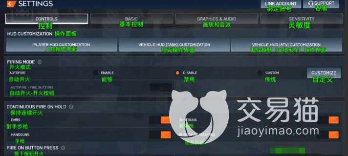 设置几大类从左到右依次是控制,基本设置,画质和音效以及灵敏度。控制界面下属从左到右有人物控制,坦克控制和全地形车控制,主要是调人物控制,比如自动开火打不打开,连续开火开关。