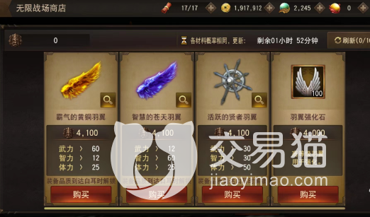这是一个比较特备的装备,目前在三国类手游中看到的还是不多的,大家可以在游戏中穿戴好羽翼,以此来提升自己的基础属性,一个羽翼可以为角色带来三个方面的属性提升,大家可以通过战场商店来进行购买,在后续的过程中羽翼也会有专属的强化石提升方式。