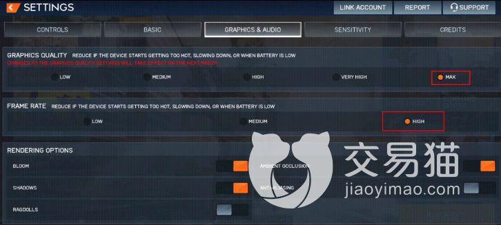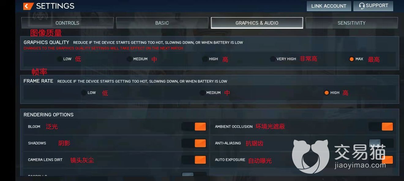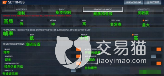 第二行的frame rate,即帧数,尽量能拉高就拉高,否则低帧数玩射击游戏,不少人更容易头晕,而且玩起来瞄准也很不方便,当然这也需要硬件支持。画质里面还有不少具体的小设置选项,比如爆炸,阴影,环境光遮蔽,抗锯齿等等,对手机上GPU的负载各有不同。