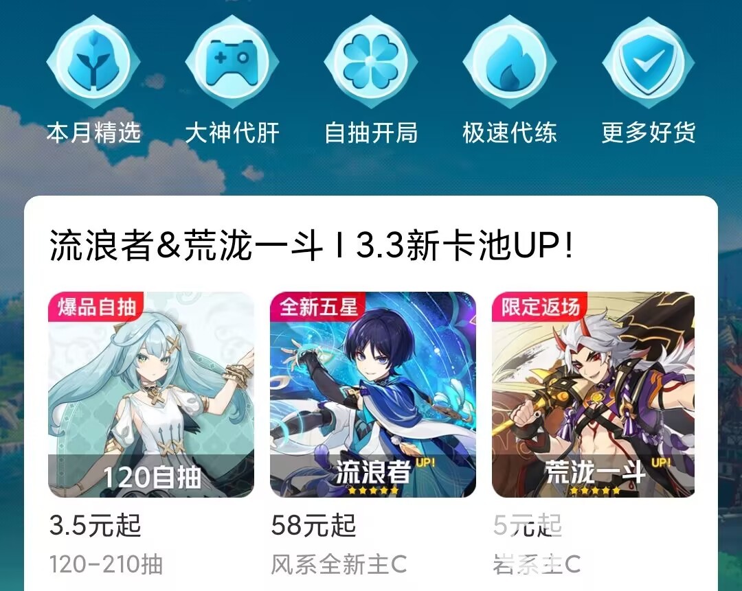 原神在交易猫内算是一个比较重要的交易专区,为大家贴心的划分了:本月精选、大神代肝、自抽开局、极速代练以及自抽好货等相关服务,买号之前没有目标的话可以直接根据这几个大类依次逛逛。如果是稍微对原神有些了解,那可以向下滑动看有没有自己心仪的英雄自抽号,像什么雷电将军、纳西妲都是10块钱左右的初始号就可以入手。