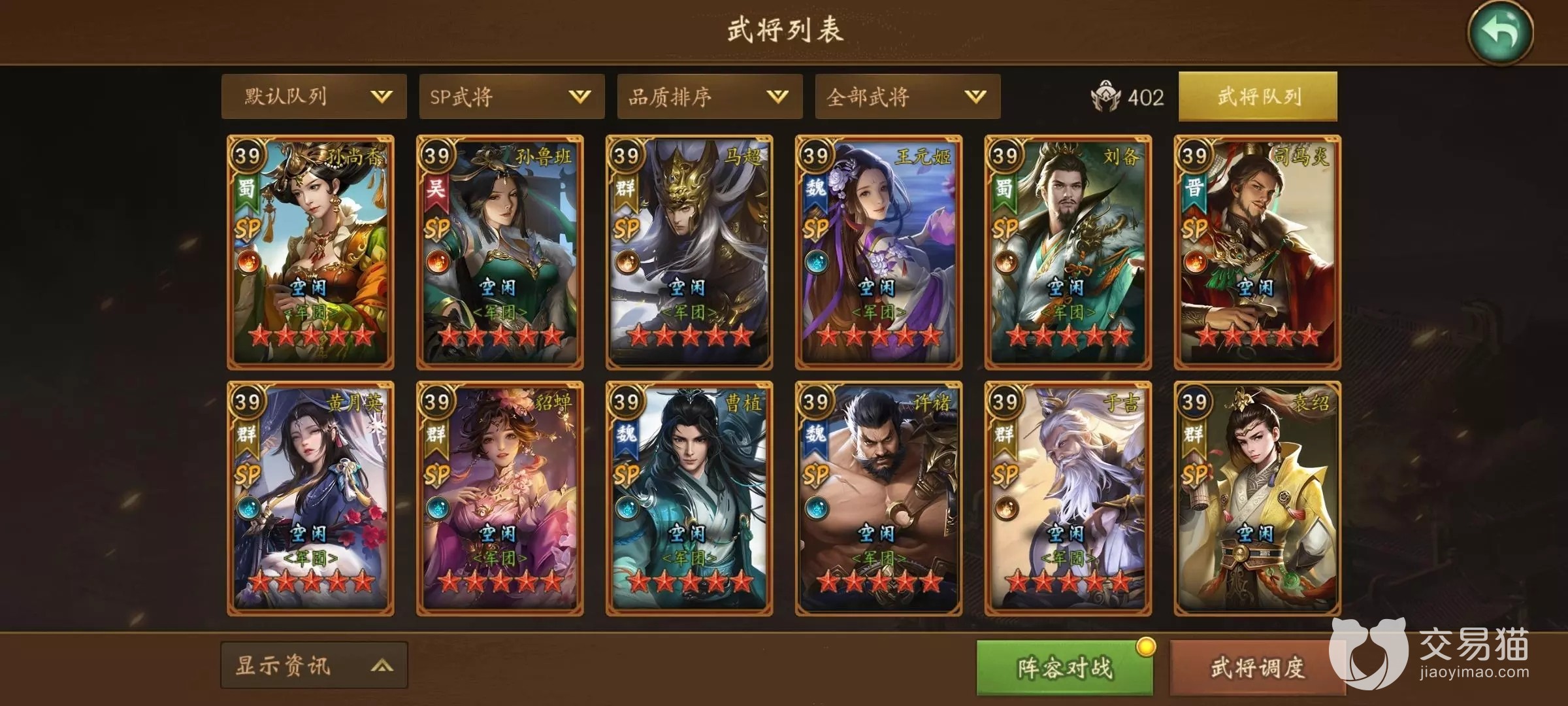 交易猫的朕的江山游戏专区有着各种预算范围的账号让大家随意挑选,具体还要看对账号的战斗力和武将方面有没有要求,如果是对该游戏丝毫不了解,不知道该如何选择。可以通过专区的搜索界面了解一下最近其他用户在关注什么,比如说sp许储和sp孙权的组合,最近十分火爆,那就可以专门的筛选有这两个武将的账号。