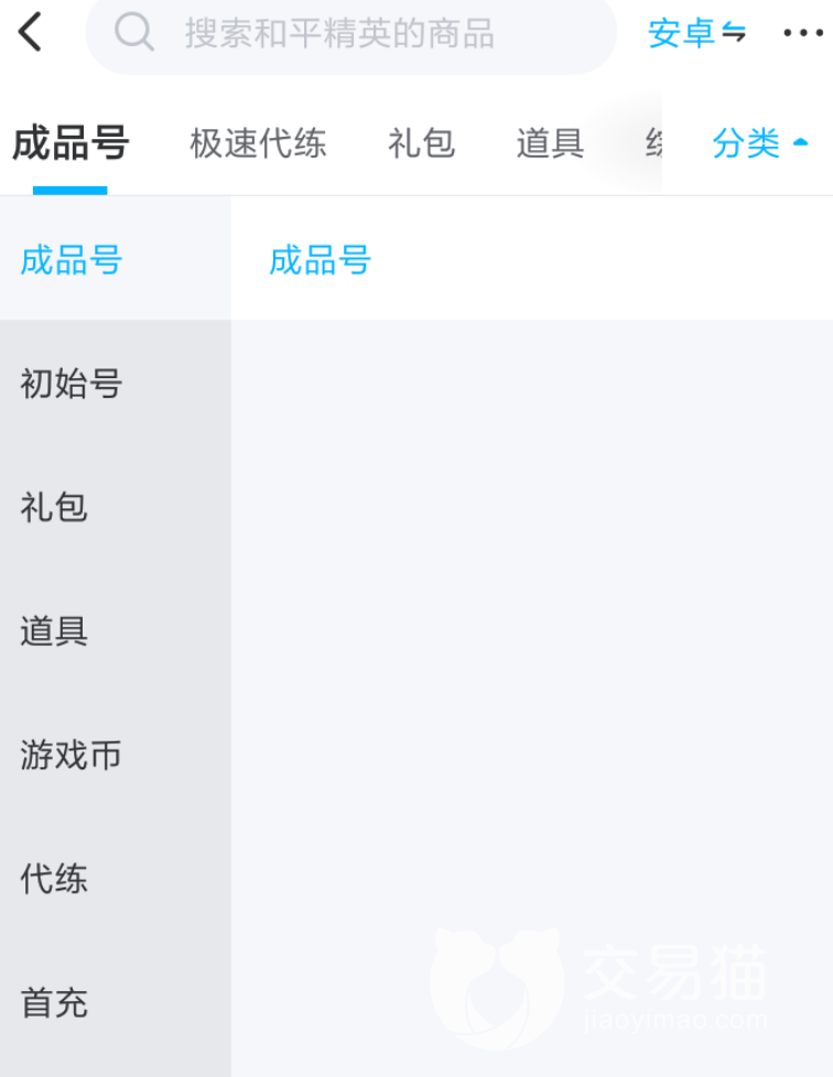 3、同时,在分类页面之下,大家也可以了解到更多关于和平精英的游戏商品类型。玩家如果打算在购买的时候了解一下,就可以利用分类功能来进行查询。除了成品号内容,大家还可以获取到大量初始号交易商品。