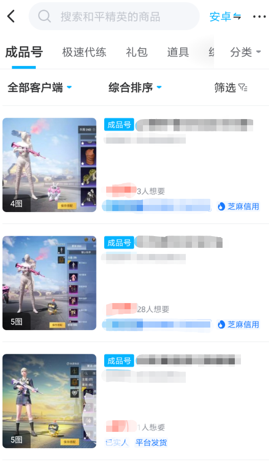 2、大家在刚进入到游戏的交易区时,就可以发现大量的游戏成品号,这一类账号和扫码号最大的区别在于,成品号当中包含了大量游戏道具和皮肤,可以让玩家获得更好的游戏体验。各位需要通过筛选功能,去更精准的找到扫码号的交易信息。
