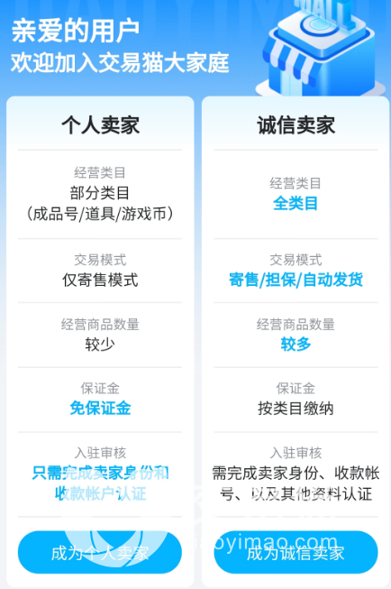 2、要是想把账号给卖出去前提是成为卖家,在交易猫里申请卖家无需审批,只要个人身份信息真实,一分钟就能注册成为个人卖家,要是说手中货源比较大的话,可以申请诚信卖家来批量出售,大家没事的时候可以点开几个诚信卖家的账号,每个人都是入驻了非常之久。